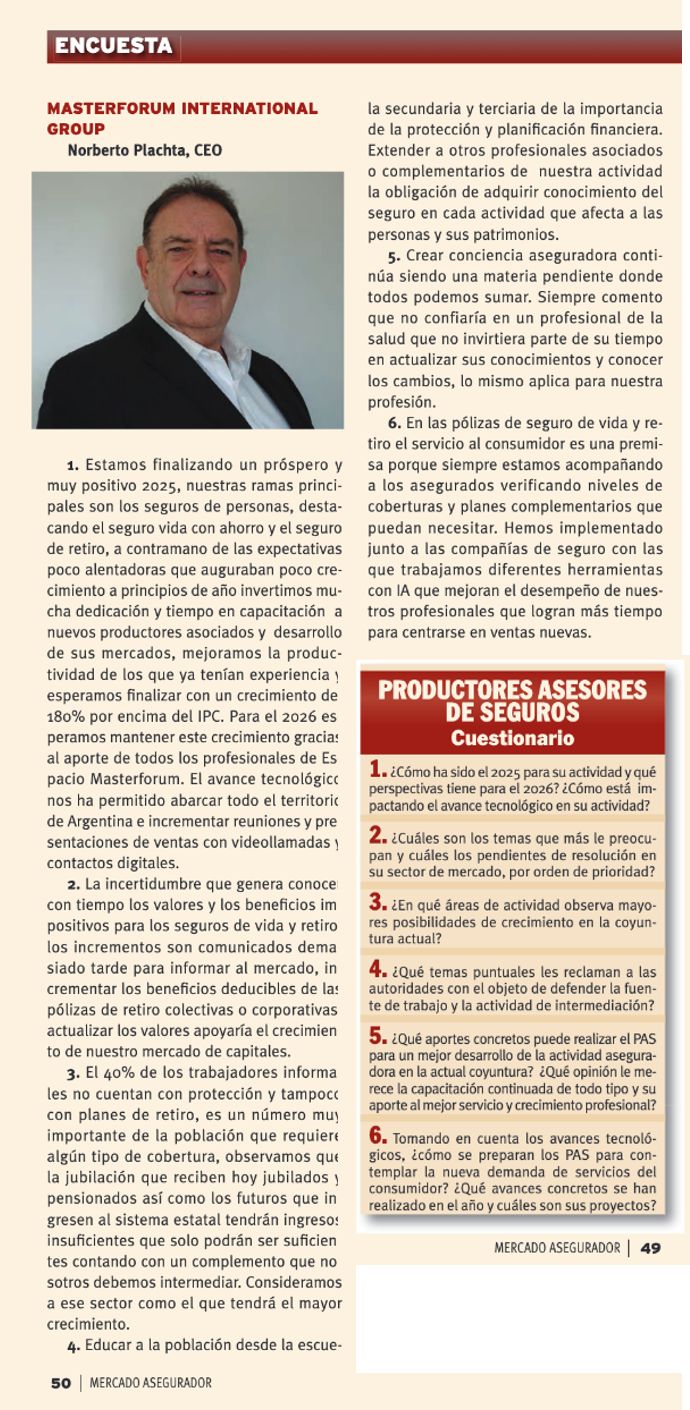 Compartimos con todos Uds. las preguntas y respuestas de Norberto Plachta realizada por la revista Mercado Asegurador para su encuesta 48° aniversario realizada en Diciembre de 2025.